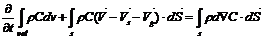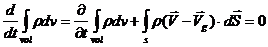 On the right hand side, the first term represents the rate of change of mass included in the control volume. The second term represents the mass flux flowing through the surface of the control volume. Where,