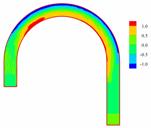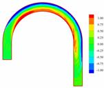 The laboratory data used to validate the present numerical model were collected by Yen et al. (1995). The experiments were conducted in a laboratory channel bend having a central angle of 180. a radius of curvature along center bend line of rc = 4m, and a width of B = 1m. The base flow was set at Q0 = 0.02m3/s, corresponding to a base flow depth of h0 = 5.44 cm, a mean velocity of u = 0.38m/s. The sediments were specified by the initial median diameter of d50 = 1.0mm and their standard deviation of σ0 = 2.5. The initial bed slope was S0 = 0.002. Bed topography and transverse sediment sorting were investigated.