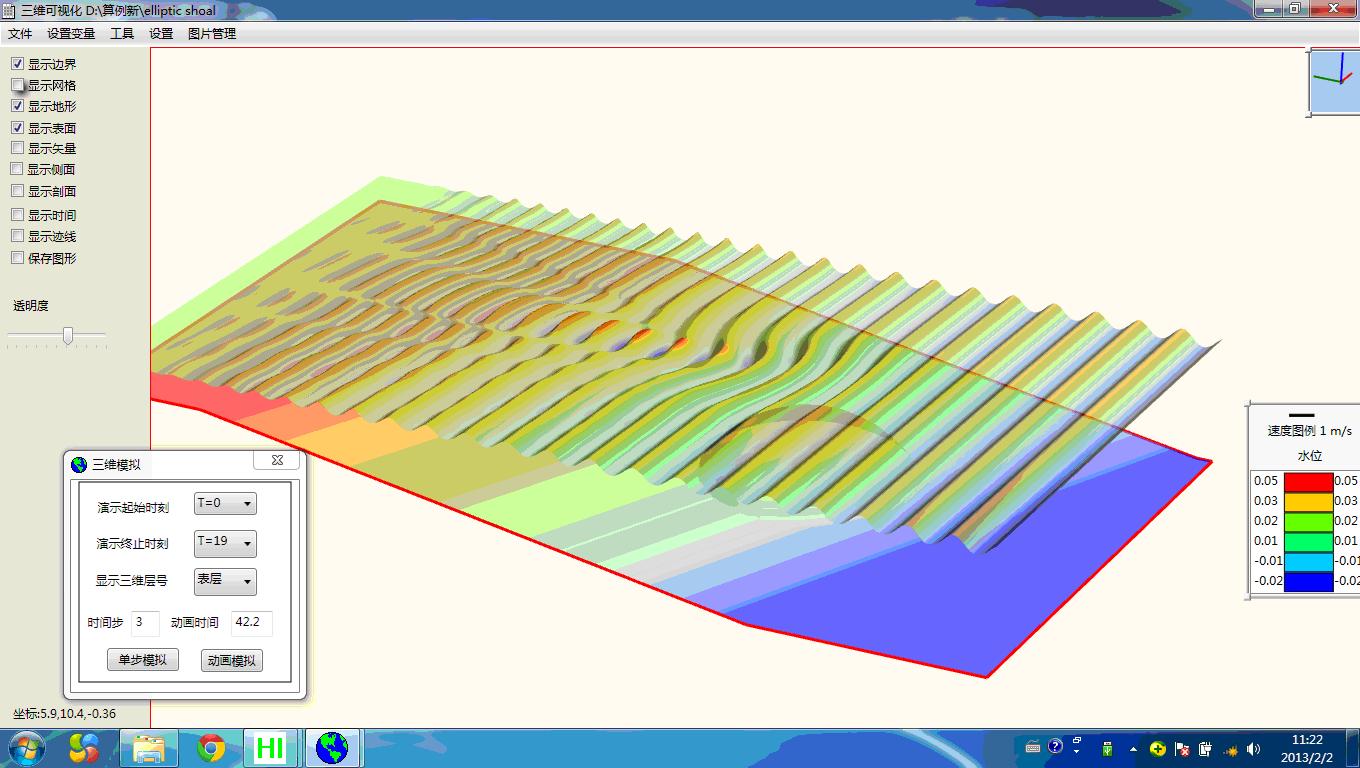 波浪通过椭圆形浅滩的传播变形是一类经典的算例,广泛的应用于验证各类数值模型模拟波浪浅化、非线性效应、折射、绕射等现象的能力。Berkhoff的实验研究结果更多的应用于验证基于水深平均的模型和基于Laplace方程的模型。近年来,随着计算机能力的提高,通过直接求解Navier-Stokes方程模拟波浪通过椭圆形浅滩的传播变形的三维数值模型越来越可行。针对Pengzhi Lin所选算例,采用非静压数值模型,垂向分2层来模拟椭圆形浅滩上波浪的传播变形。