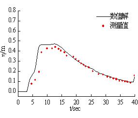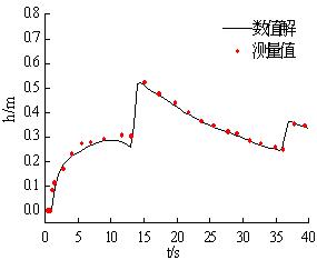 物理模型由一个蓄水池和一个矩形渠道构成,河道是长为22.5m,宽为6m的矩形河道,在距起点25.5m处有一个三角形的挡水物,左边有一个长为15.5m,深为0.75m的水库,水库以下都为干,计算域由4512个三角形单元所覆盖,底面糙率为0.0125。将计算结果和测量结果进行比较,验证了本文的模型能很好的处理存在摩阻源项和动边界的问题,解决实际物理问题的能力。